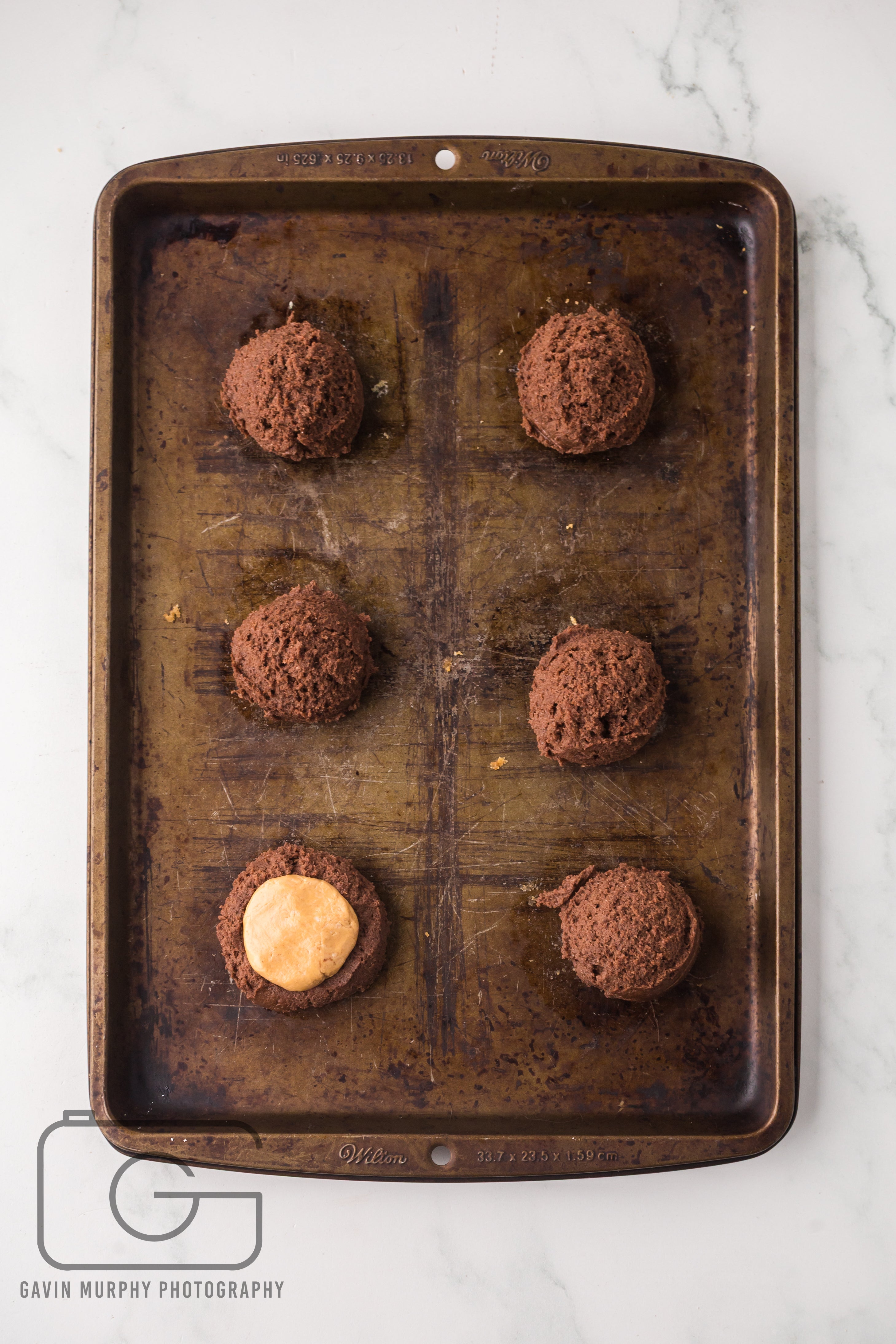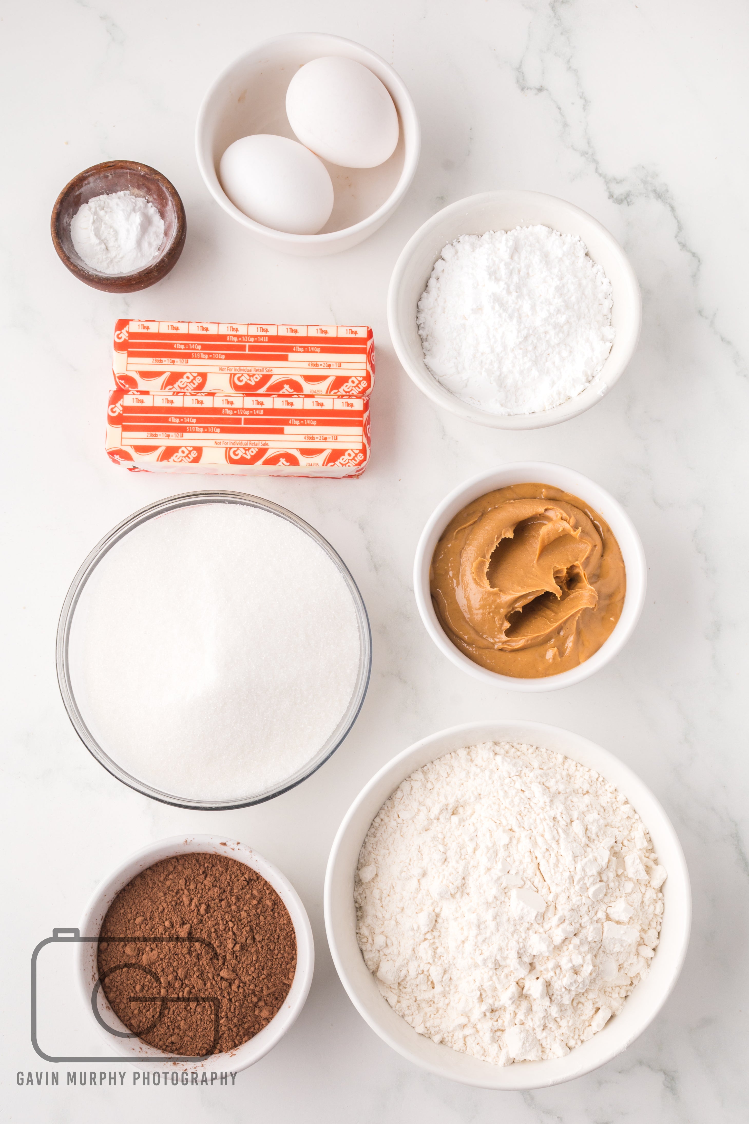 Ingredients: Salted butter, white granulated sugar, eggs, cocoa powder, baking soda, baking powder, flour, peanut butter, powdered sugar